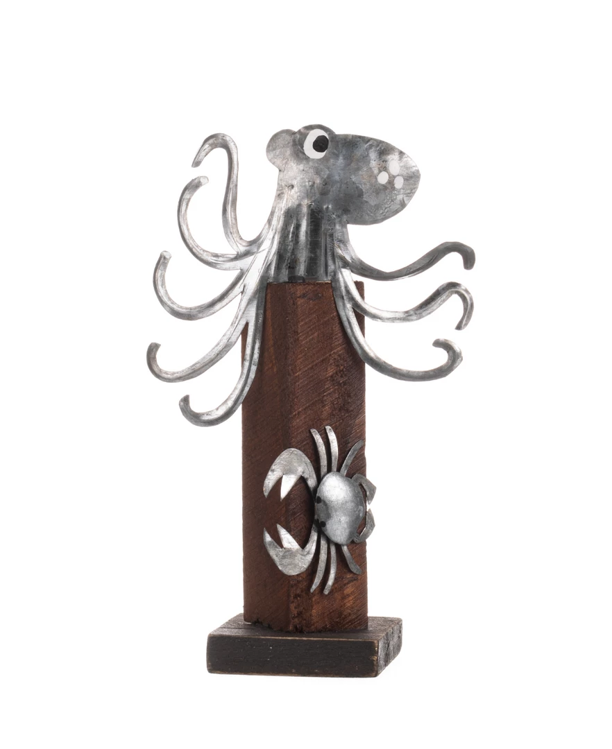 Metal and wooden Shoeless Joe ornament with a silver metal octopus at the top and a cute silver metal crab. Perfect for a nautical themed room!