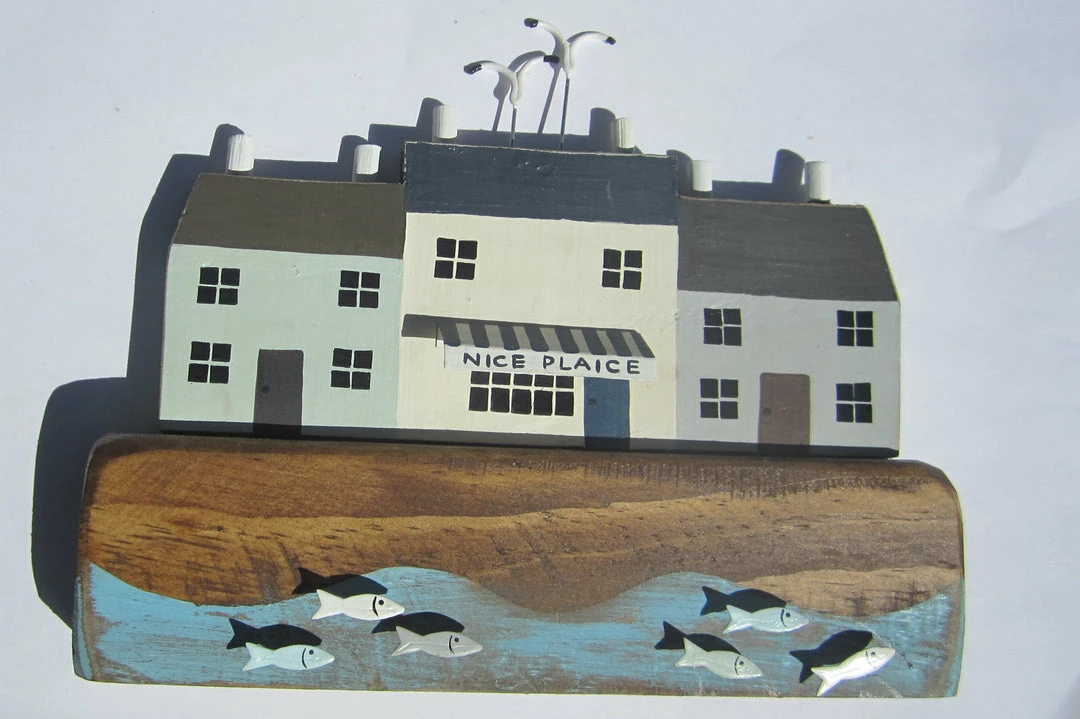 AΒ fun rustic scene withΒ three seaside shopsΒ with a metal awning over theΒ fish shop.Β