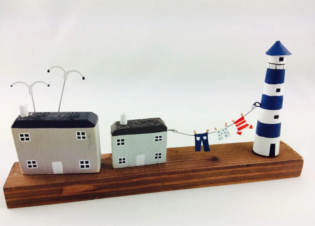 Aย lovely rustic scene with two harbour houses with seagulls and a lighthouse with a washing line.