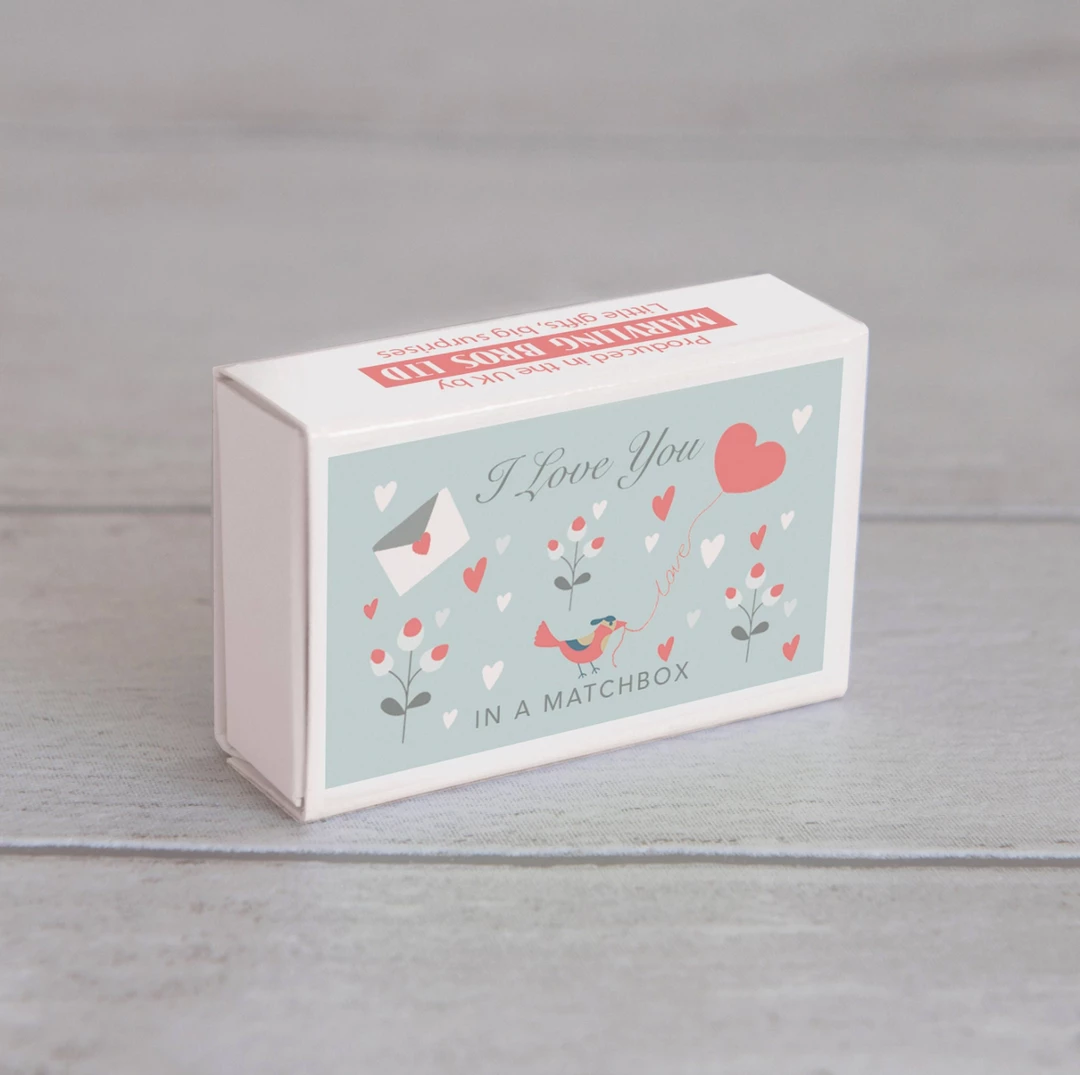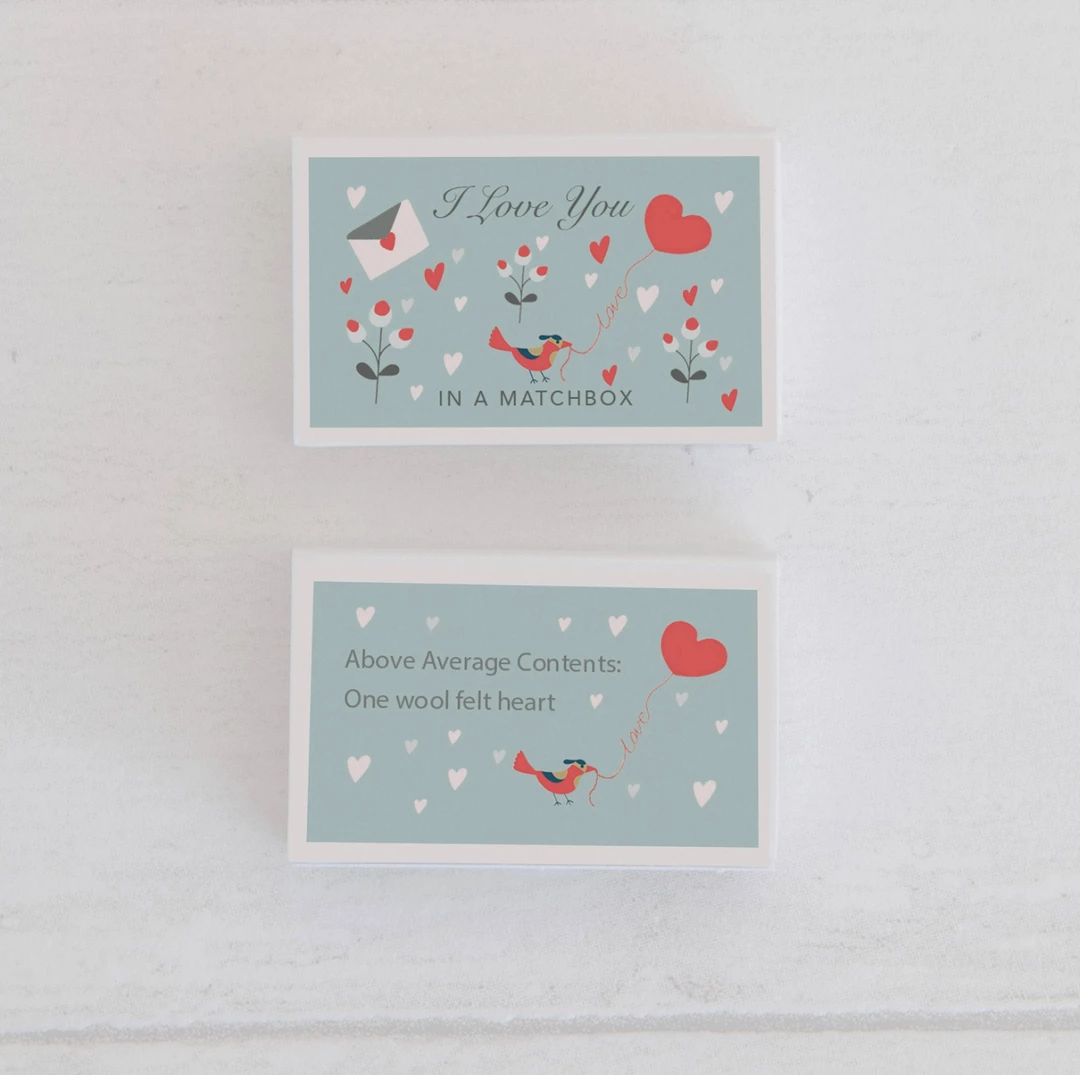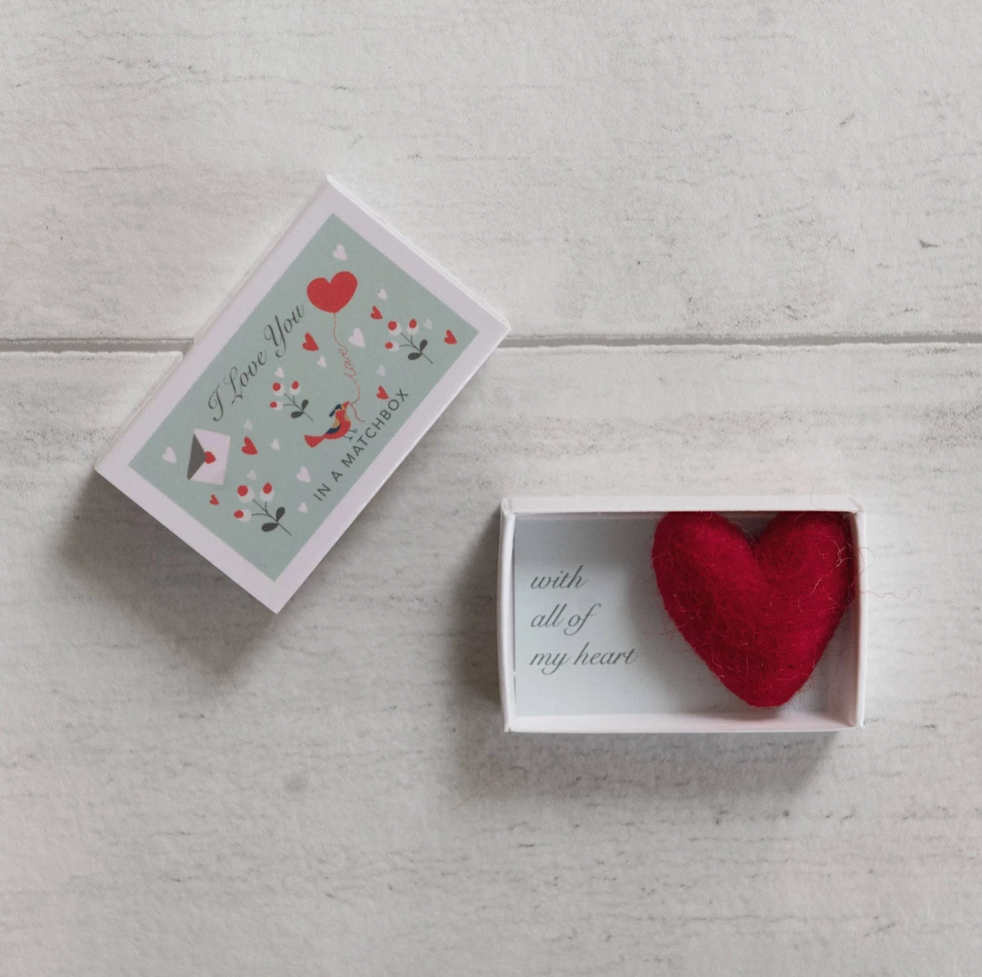 A beautiful way to show your love with this cute matchbox containing a miniature wool felt heart. Presented with the simple message ‘I Love You’, the recipient opens the box to reveal the words ‘with all of my heart’ and a handmade wool felt heart. A heart warming, thoughtful letterbox gift to send to a loved one.